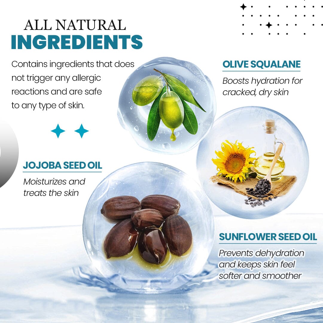 "Here in HeelHaven™ we have combined the 3 most powerful natural moisturizers into one stick for treating and preventing cracked heels: Olive Squalane, Jojoba Oil, and Sunflower Oil. Olive Squalane is a natural emollient that deeply moisturizes the skin and contains antibacterial properties that help to prevent infections. Jojoba Oil is rich in vitamins and antioxidants that nourish and protect the skin while also providing long-lasting hydration. Sunflower Oil is a natural hydrator that soothes and calms dry, irritated skin while also providing antibacterial and anti-inflammatory benefits. Together, these natural super moisturizers can help to repair and rejuvenate cracked heels, leaving them soft, smooth, and healthy."